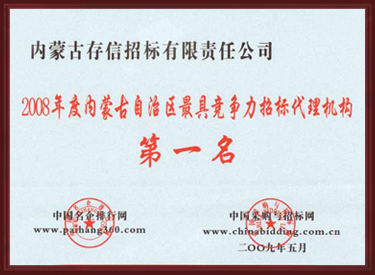 • 2008年度內蒙古自治區最具競爭力招標代理機構第一名